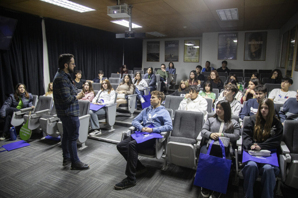 Luego, los estudiantes conocieron las características curriculares y oportunidades laborales que ofrece Cine y Comunicación Audiovisual UDD, de la mano del director de carrera, Andrés Waissbluth y las estudiantes Sofía Arroyo, seleccionada en Annecy (Francia), y Valentina Neira.